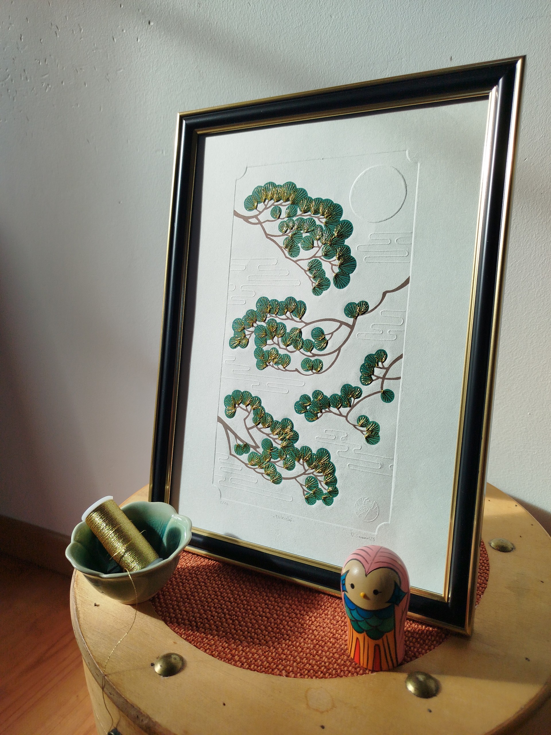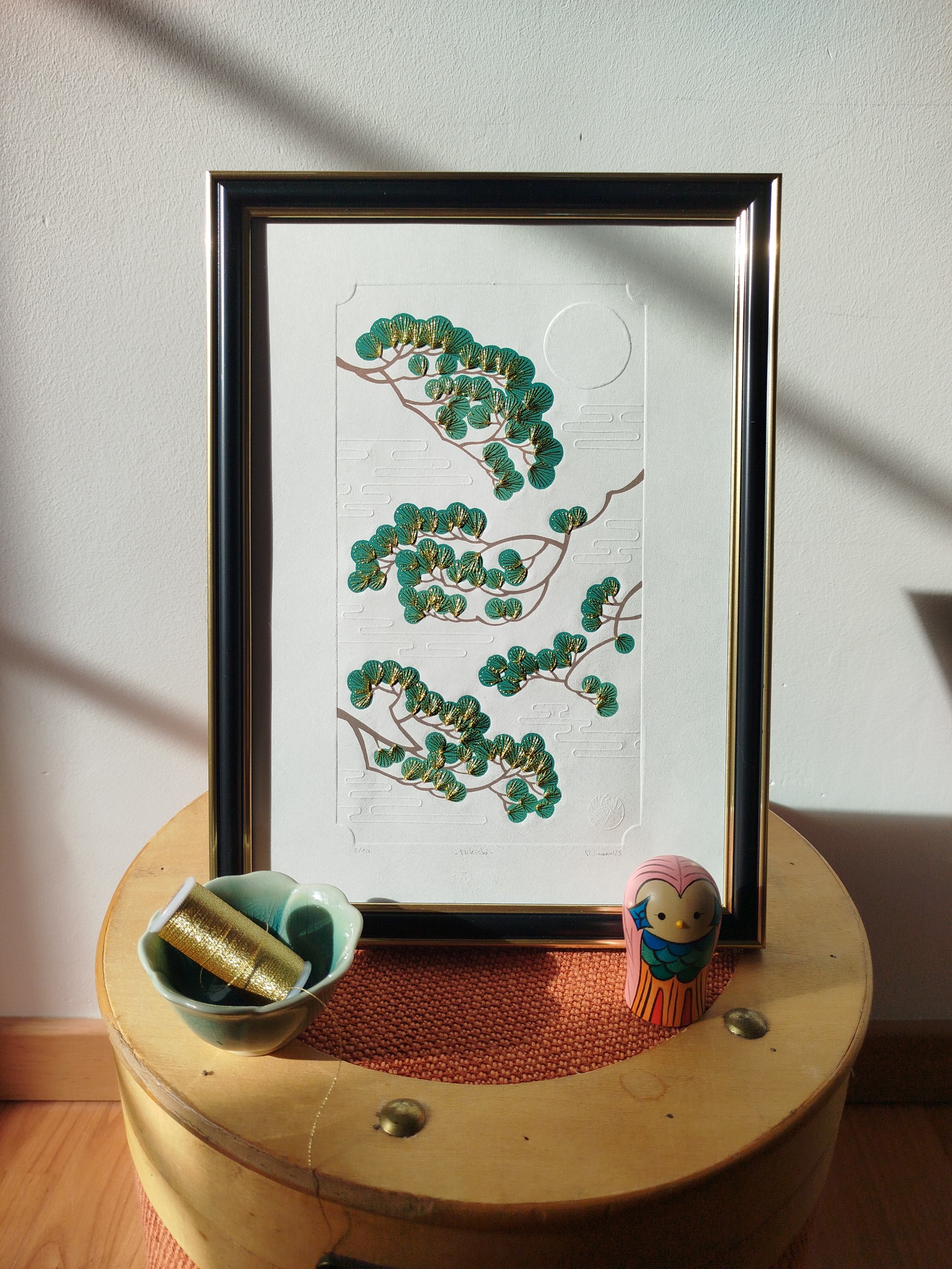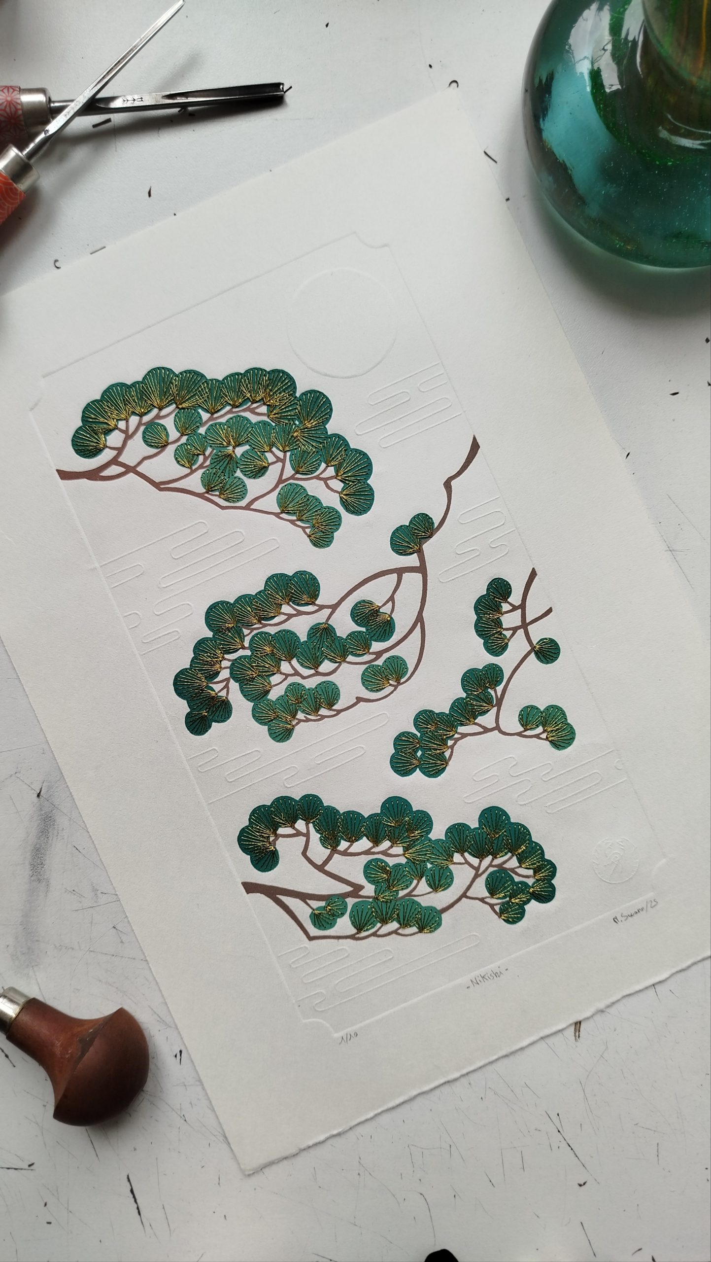 Toutes les gravures proposées sont des œuvres originales gravées et imprimées (voire brodées, dorées ou embossées, selon le cas) à la main et en édition limitée, dans une démarche d’artisanat d’art, depuis mon atelier. Par conséquent, les exemplaires compris dans une seule et même édition peuvent présenter quelques variations (couleurs, papier) qui, loin d’être des défauts, contribuent à les rendre uniques.