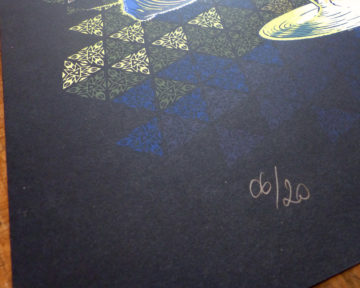 Ces estampes originales sont imprimées à la main : les linogravures tirées sur presse, les sérigraphies réalisées sur table manuelle, sans bras mécanique. Au delà de l'attention portée à chaque exemplaire, les tirages peuvent comporter de subtiles variations. Chaque tirage fait l'objet d'une numérotation et sont gaufrés et signés.