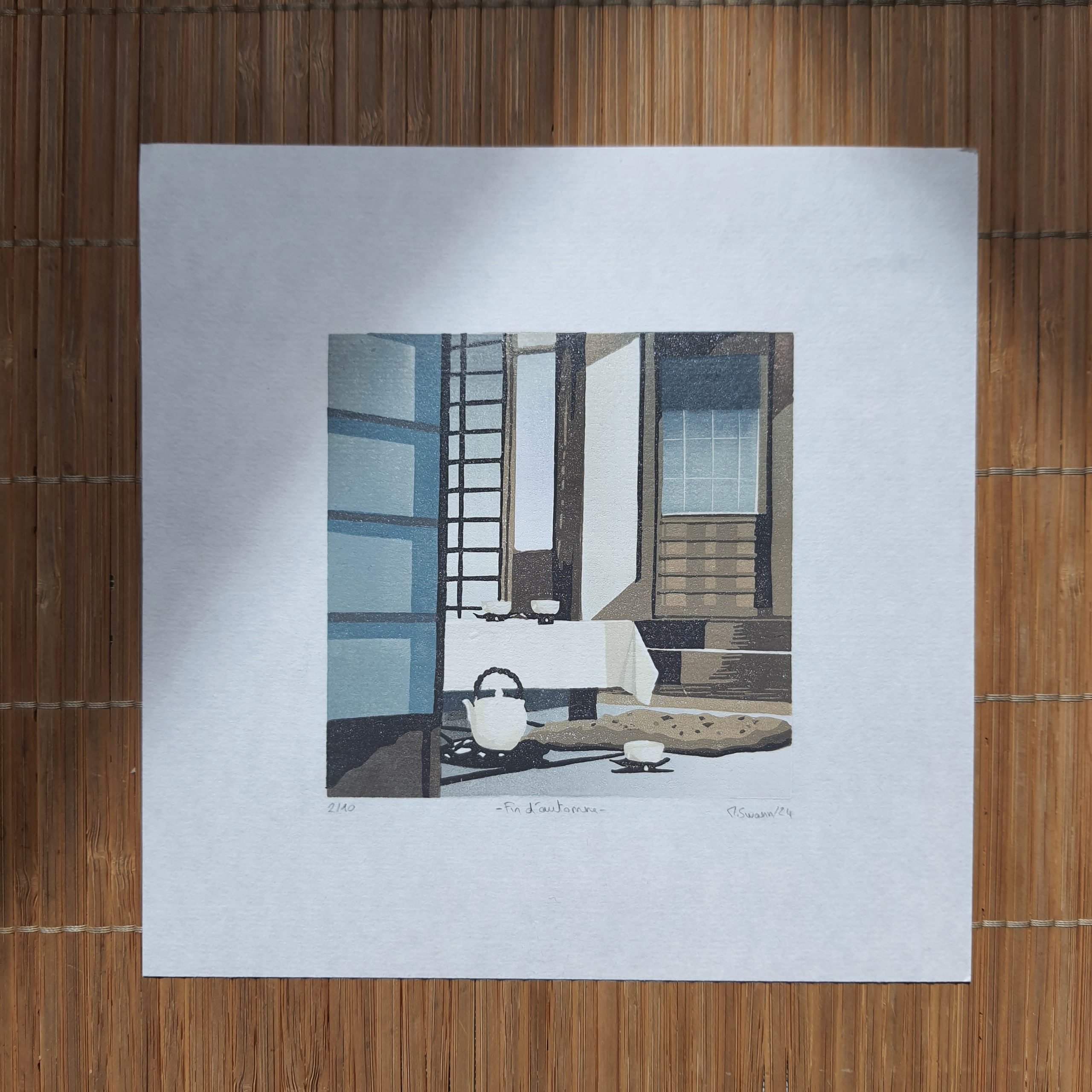 Toutes les gravures proposées sont des œuvres originales gravées et imprimées (voire brodées, dorées ou embossées, selon le cas) à la main et en édition limitée, dans une démarche d’artisanat d’art, depuis mon atelier. Par conséquent, les exemplaires compris dans une seule et même édition peuvent présenter quelques variations (couleurs, papier) qui, loin d’être des défauts, contribuent à les rendre uniques.